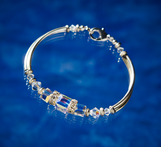 This is a case of the more the merrier. Because of it’s easy wearability this bracelet screams stack some more on. It looks great with more stackers or paired with the Simpicity, Solid Cube or the Charm bracelet for maximum bling. The 8 mm centre Swarovski Crystal cube is surrounded by Swarovski Rhinestones and 6mm Cubes. The tubes and findings are all sterling silver.