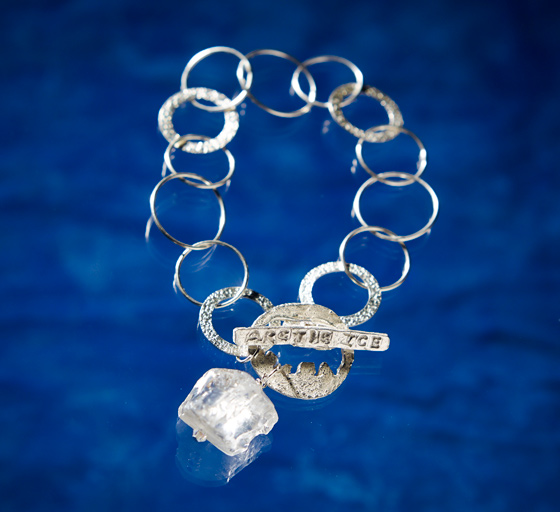 The Polar Ice Bracelet is available in 3 sizes to fit most wrists comfortably. The chain is the same big circle sterling chain as in the necklace. The closure is a smaller version of the same. The dangling crystal is a smaller version of those in the necklace and flanked by Swarovski Crystal. This bracelet is meant to fall a bit below the wrist line not tight fitting.